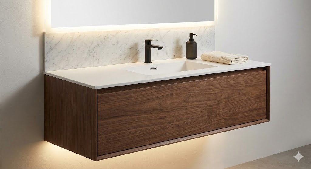 Modern vanities, sinks, and hardware for instant style boosts.
